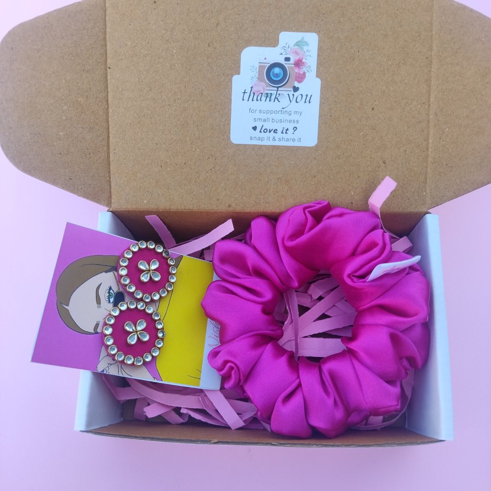 Pack of 1 Minimal Stud Earring in beautiful hot pink color and a Fuchsia Pink XL Size Scrunchie.